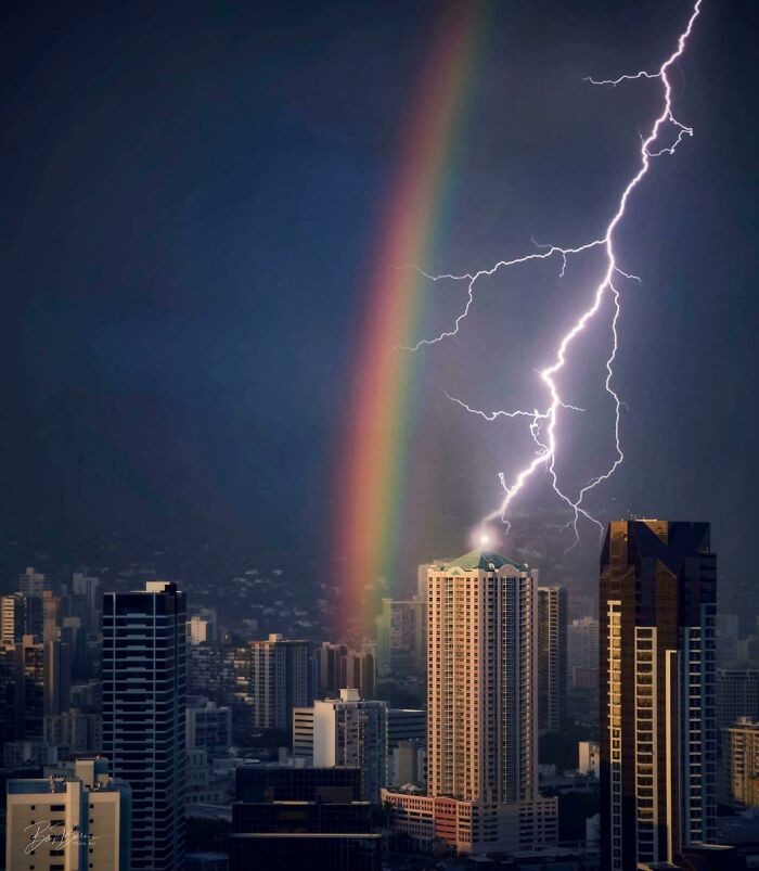 Kala sambaran petir berbarengan dengan sinar pelangi. Indah namun menakutkan. Β