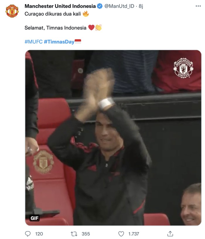 Akun MU Indonesia turut mengucapkan selamat kepada Timnas Indonesia. Foto: Twitter