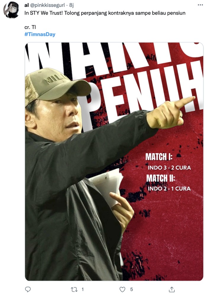 Tak hanya mengucapkan terima kasih kepada punggawa Garuda, netizen juga mengapresiasi taktik Pelatih Shin Tae-yong hingga mampu mengalahkan negara yang berasal dari Kepulauan Karibia itu. Foto: Twitter