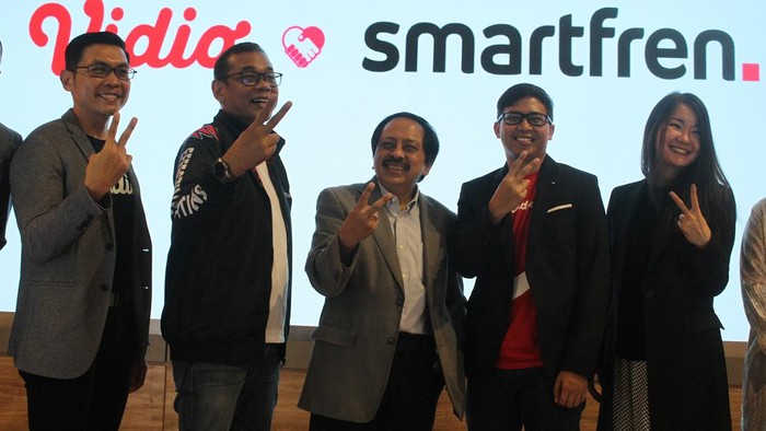 Direktur Utama PT Smartfren Telecom Tbk. (Smartfren), Merza Fachysz (tengah), didampingi Chief Product & Services Strategy Smartfren, Hermansyah Arifin (dua kiri), Yoseph Christianto, VP Business Development Vidio (pertama kiri), Chief of Product Vidio, Hadikusuma Wahab (dua kanan), dan Gisela Lesmana, Direktur Smartfren (pertama kanan) foto bersama usai peluncuran paket hasil kolaborasi antara Smartfren dan Vidio di Auditorium Smartfren, Jakarta, Selasa (27/9/2022).
