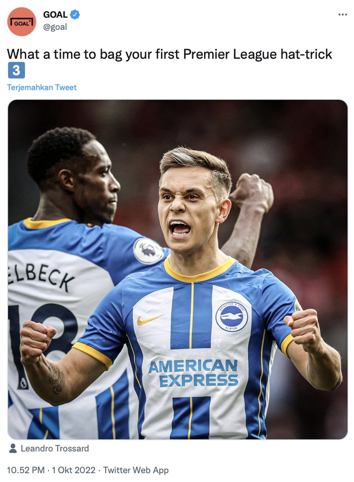 Gawang Alison dibobol tiga gol oleh satu nama saja, dia adalah Leandro Trossard. Foto: Twitter