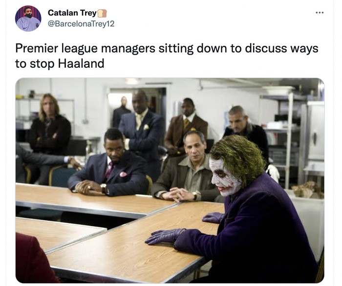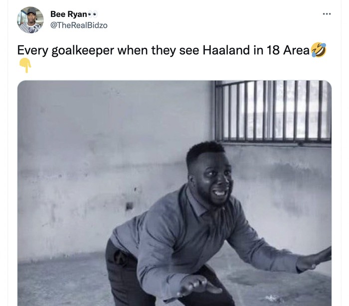 Meme setiap kiper pasti gentar seperti ini saat menghadapi kehebatan Haaland. Foto: Twitter