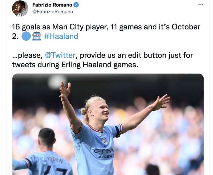 Fabrizio Romano pun memujinya. Ini baru bulan Oktober tapi Haaland sudah mencetak 16 gol di Liga Inggris. Foto: Twitter