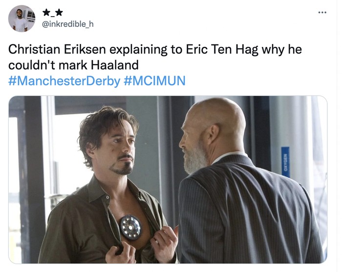 Christian Eriksen semalam pontang-panting menghadapi Haaland. Ia pun beralasan jantungnya sakit. Foto: Twitter