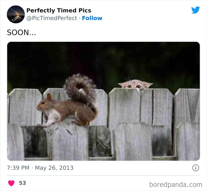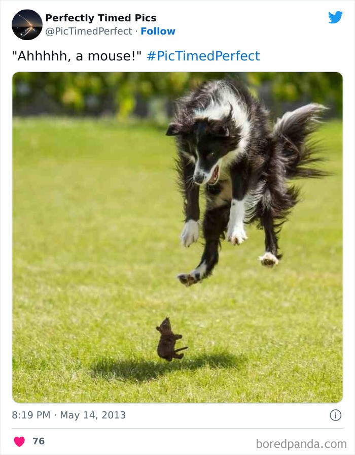 Akun Twitter @PicTimedPerfect menampilkan foto-foto yang diambil tepat waktu. Tak cukup dilihat sekali sebab selalu menghibur dan menginspirasi.