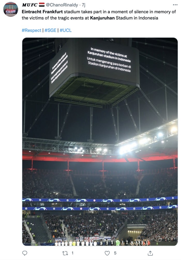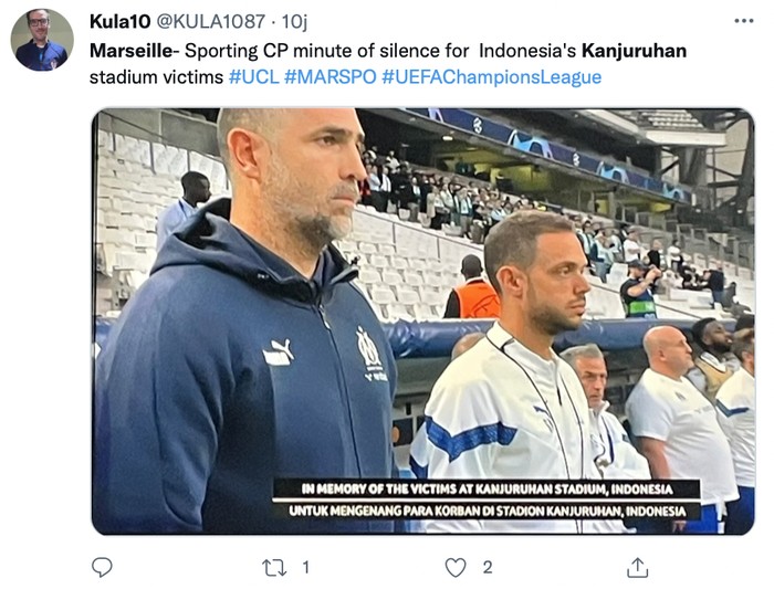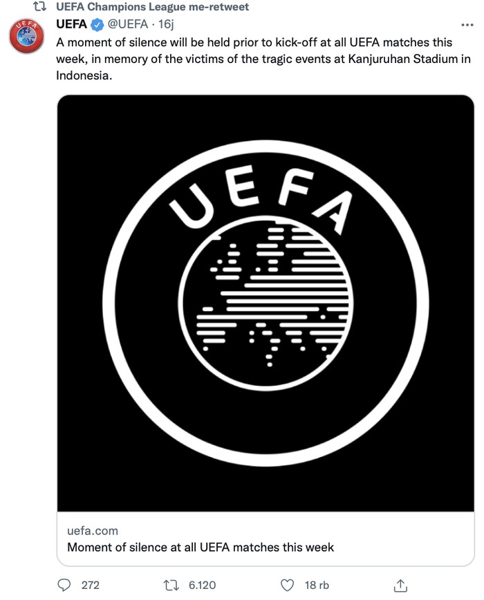 EUFA mengumumkan seluruh pertandingan Liga Champions, Liga Europa, dan Liga Conference akan diawali dengan mengheningkan cipta akan korban Tragedi Kanjuruhan yang menewaskan 131 orang. Foto: Twitter