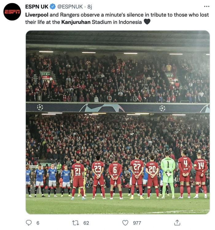 Laga UCL Liverpool vs Rangers pun melakukan mengheningkan cipta Tragedi Kanjuruhan. Foto: Twitter