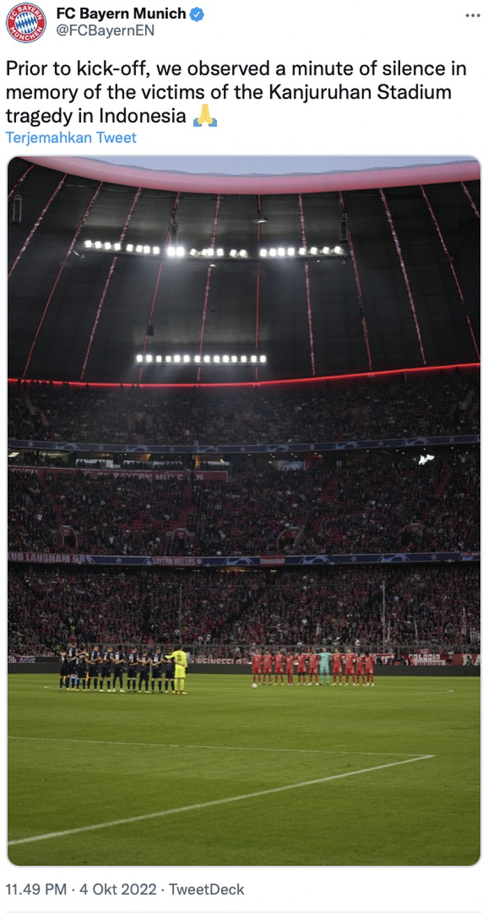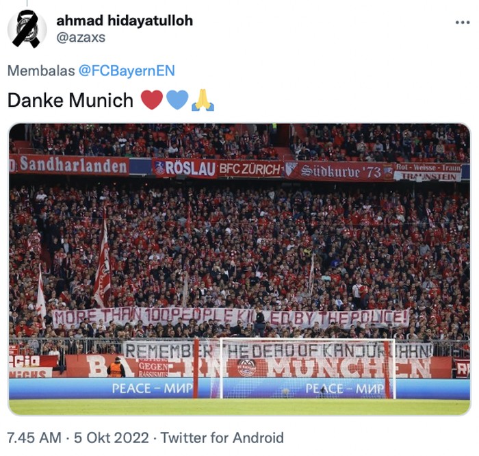 Bahkan, fans Bayern Munich membentangkan pesan khusus soal Tragedi Kanjuruhan. Foto: Twitter