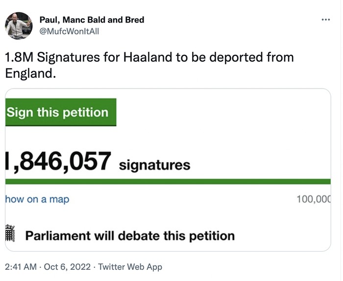 Konon ada petisi di Inggris untuk mengusir Haaland karena membuat Liga Inggris seakan jadi liga lemah. Foto: Twitter