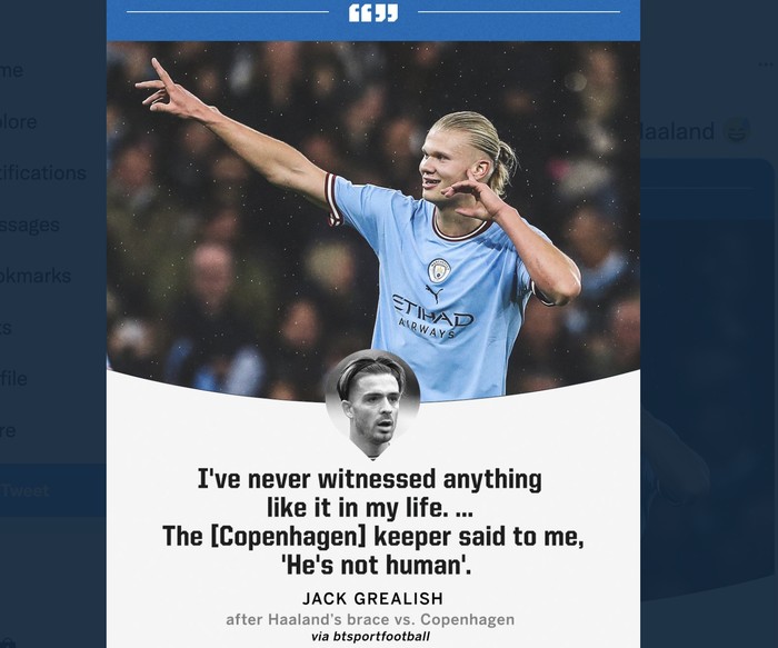 Rekan setim Haaland, Jack Grealish, mengisahkan bahwa kiper Copenhagen sampai bilang bahwa Haaland bukan manusia. Foto: Twitter