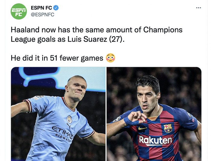Haaland mencetak gol sama jumlahnya dengan Luis Suarez di Liga Champions dengan 51 laga lebih sedikit. Foto: Twitter