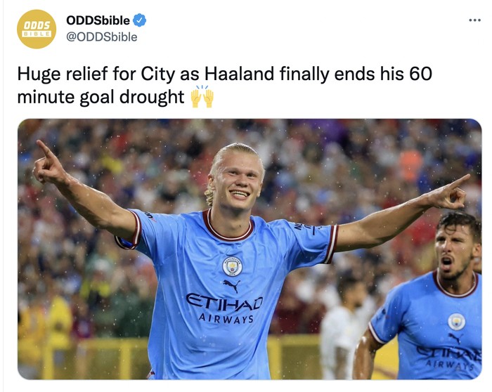 Semalam, Haaland mencetak gol keempat City. "Akhirnya Haaland mengakhiri puasa gol di menit ke-60," canda akun ini. Foto: Twitter