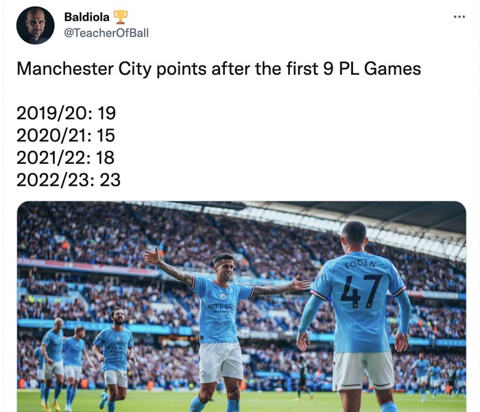 Poin City setelah 9 laga di Liga Inggris musim ini adalah yang terbaik dibanding sebelumnya. Foto: Twitter