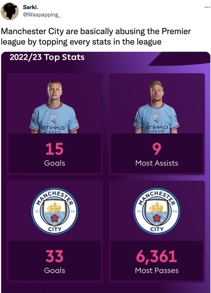 Erling Haaland membuat Liga Inggris seolah menjadi Farmers League atau Liga Petani, istilah untuk menggambarkan sebuah liga yang terlalu didominasi sebuah klub, dalam hal ini ya Manchester City. Foto: Twitter