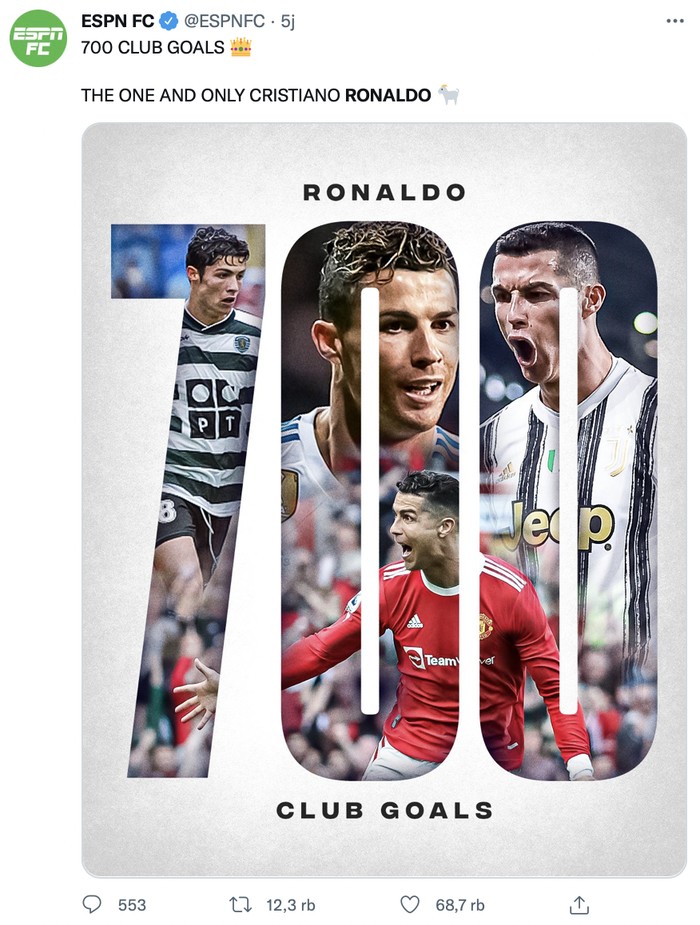 Torehan 700 gol untuk klub bukan prestasi mudah tapi bisa dilampaui Ronaldo. Foto: Twitter
