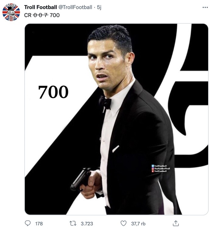 Meme Cristiano Ronaldo cetak 700 gol untuk klub. Foto: Twitter