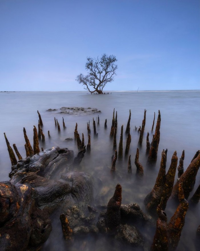 Honorable Mention kategori Landscape diraih Waluya Priya Atmaja, Indonesia.Β Foto ini diambil di Lamongan, Jawa Timur saat matahari terbenam. Penanaman mangrove dilakukan untuk mengurangi dampak abrasi di sekitar kawasan ini. Foto: TNC 2022