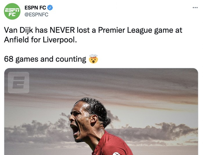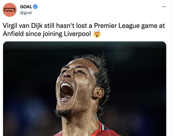 Virgil van Dijk di sisi lain belum pernah kalah jika membela Liverpool di Anfield. Foto: Twitter