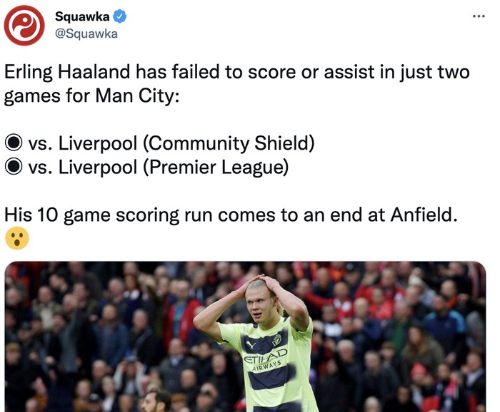 Haaland mencetak gol 10 kali berturut-turut sebelum ngadat melawan Liverpool semalam. Foto: Twitter