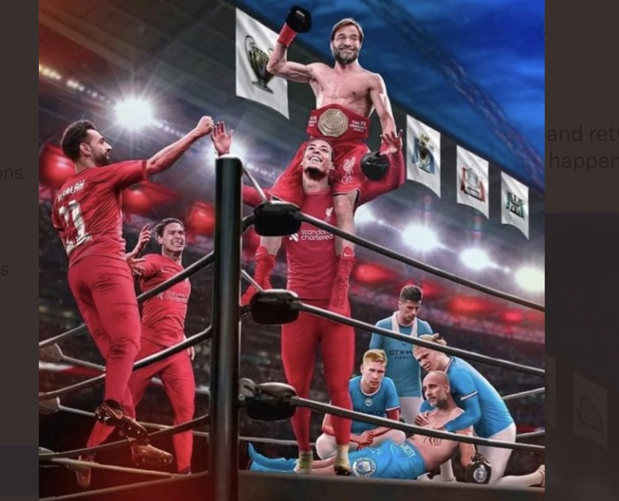Jurgen Klopp digambarkan berhasil memukul KO Pep Guardiola. Foto: Twitter