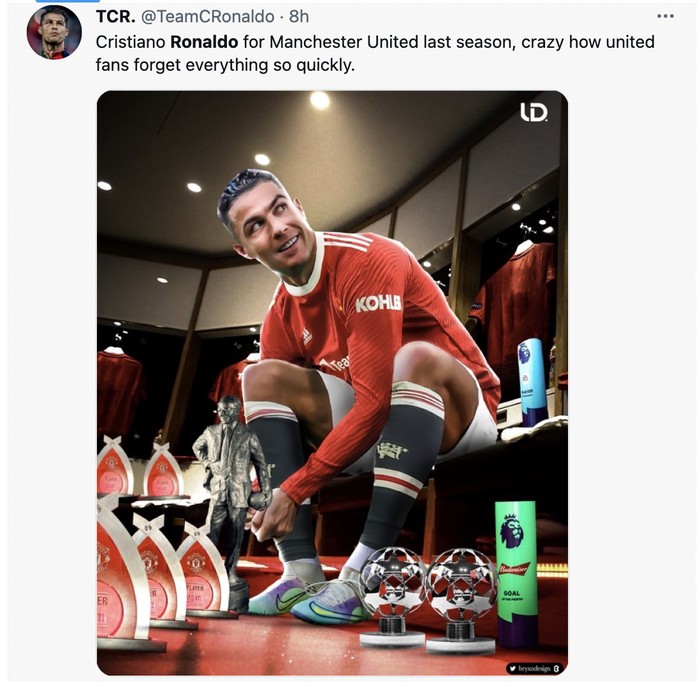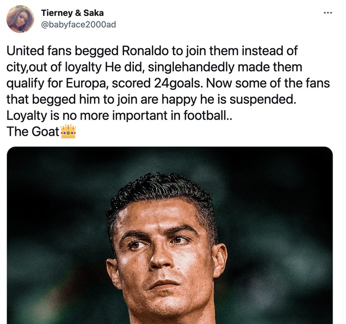Padahal fans musim lalu merengek agar Ronaldo ke MU dan Ronaldo pun bagus performanya. Kini mereka malah senang Ronaldo diskorsing. Foto: Twitter