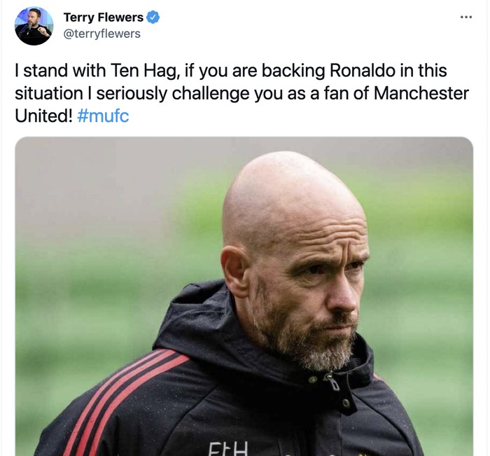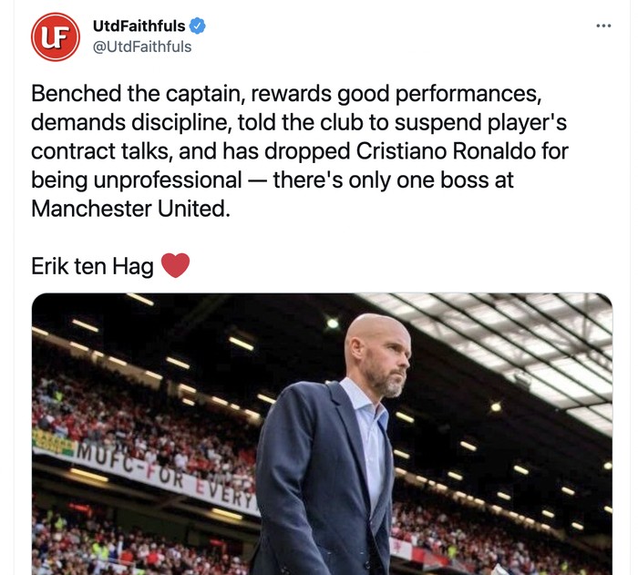Tentu ada yang mendukung Ten Hag karena keberaniannya dan kedisiplinannya, termasuk menghukum Ronaldo karena tidak profesional. Foto: Twitter