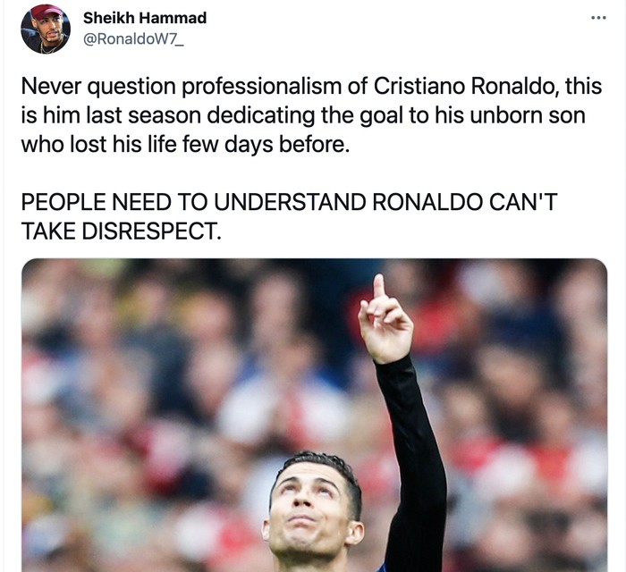 Akun ini mengatakan jangan pernah meragukan profesionalisme Ronaldo. Dia pernah tetap bermain apik musim silam saat anaknya meninggal. "Orang perlu memahami Ronaldo tidak bisa menerima sikap tak hormat." Foto: Twitter