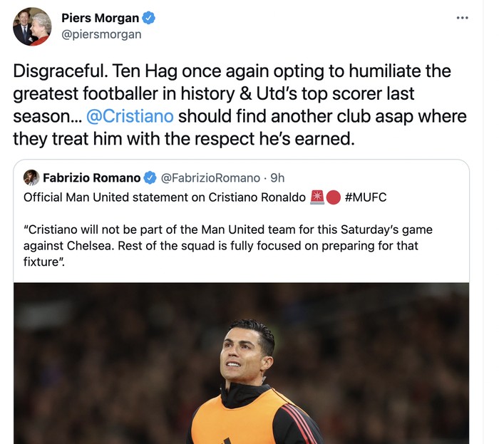 Presenter kenamaan Piers Morgan mengecam hukuman untuk Ronaldo. "Memalukan, Ten Hag sekali lagi memilih mempermalukan pesepakbola terbaik dalam sejarah dan top skor MU musim silam. Cristiano harus menemukan klub lain yang memperlakukannya dengan respek," tulisnya di Twitter. Foto: Twitter