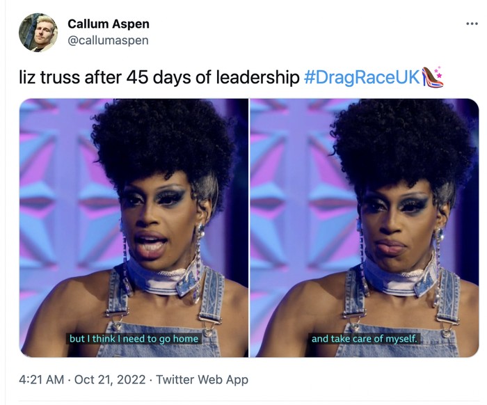 Meme Liz Truss mau pulang saja dan tak lagi jadi PM. Foto: Twitter