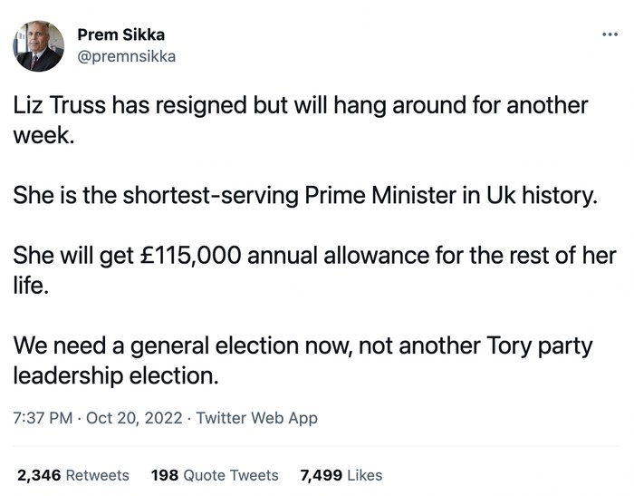 Akun ini menyebut Liz Truss adalah PM Inggris dengan masa jabatan terpendek sepanjang sejarah. Walau begitu, dia akan tetap mendapatkan dana pensiun. Foto: Twitter