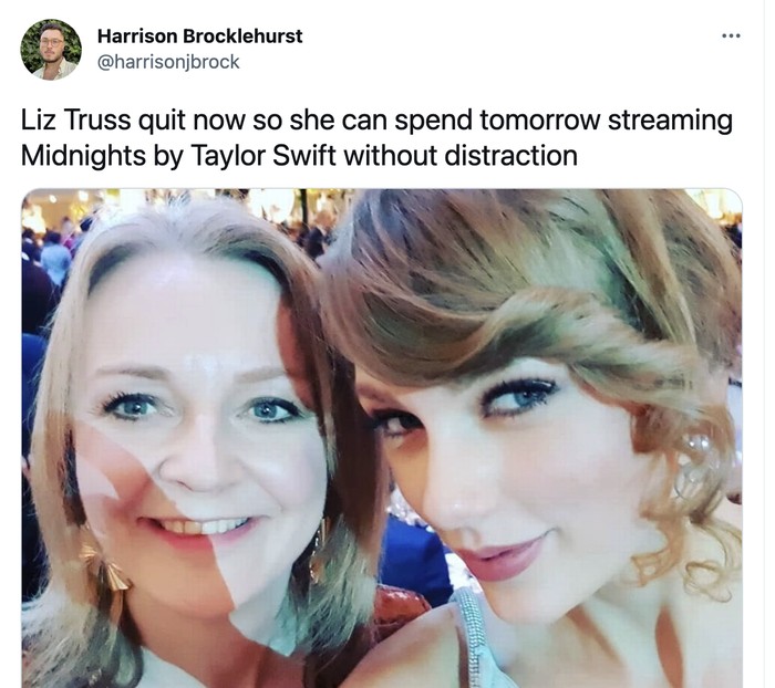 Setelah resign dari PM Inggris, Liz Truss bisa lebih punya banyak waktu melakukan apapun termasuk dengan Taylor Swift. Foto: Twitter