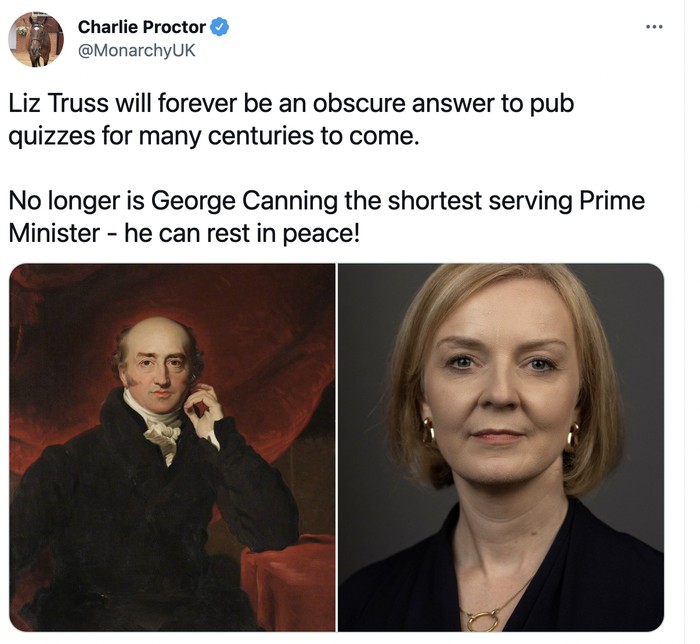 Liz Truss mengalahkan rekor George Canning sebagai PM yang jabatannya terpendek sepanjang sejarah Inggris. Foto: Twitter