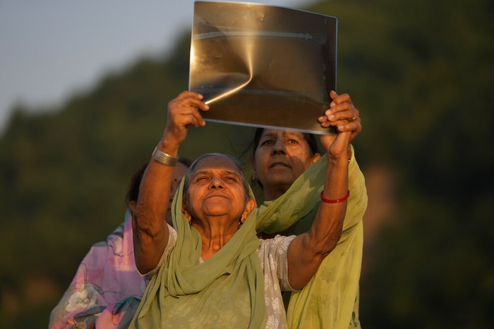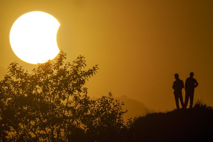 Siluet orang-orang yang menonton gerhana Matahari parsial terlihat dari Kathmandu, Nepal. Foto: AP/Hassan Ammar