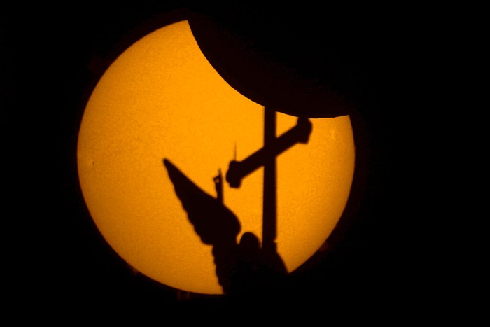 Ini adalah landmark kota St. Petersburg, Rusia, di atas puncak menara Katedral Saints Peter dan Paul. Tampak siluet melawan Matahari saat gerhana Matahari parsial. Foto ini diambil melalui teleskop dengan filter spektrum sempit hidrogen-alfa (H-alfa) yang memungkinkan penelitian aktivitas permukaan Matahari. Foto: AP/Hassan Ammar