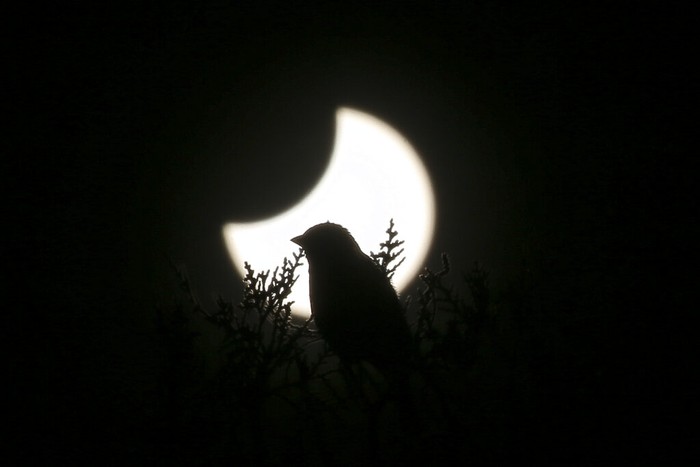 Siluet burung saat Matahari membentuk Bulan sabit saat gerhana Matahari parsial di Istanbul, Turki. Foto: AP/Hassan Ammar