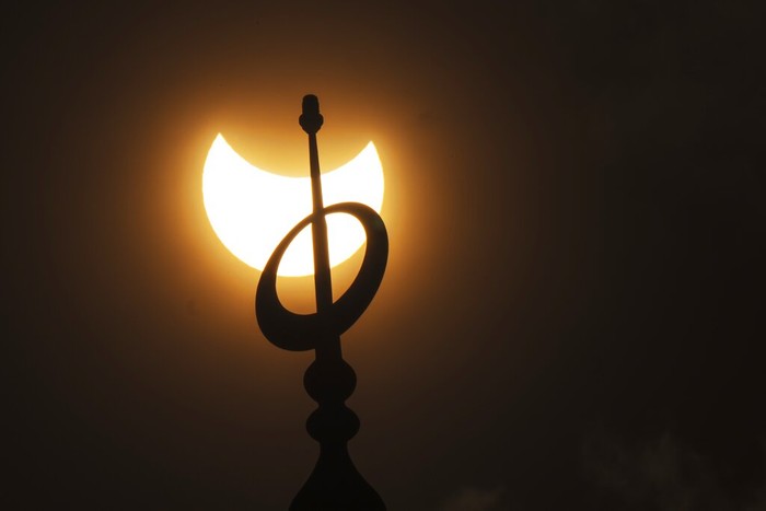 Menara Masjid Mohammad Al-Amin dalam siluet menghadap Matahari saat Bulan menghalangi sebagian Matahari selama gerhana Matahari parsial di pusat kota Beirut, Lebanon. Foto: AP/Hassan Ammar