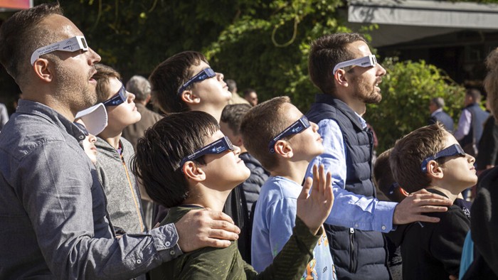 Para siswa dan guru di sebuah sekolah di Pristina, Kosovo, ramai-ramai menyaksikan gerhana Matahari menggunakan kacamata khusus. Foto: AP/Hassan Ammar