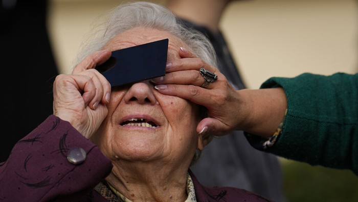 Seorang wanita lansia di Bucharest, Rumania, tak mau ketinggalan menonton momen langka ini. Ia melihat gerhana Matahari melalui filter. Foto: AP/Victor Berezkin