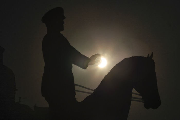 Bulan menutupi sebagian Matahari, selama gerhana Matahari parsial di monumen Marshal Soviet Georgy Zhukov di Moskow, Rusia, Selasa, 25 Oktober 2022. Foto: AP/Victor Berezkin