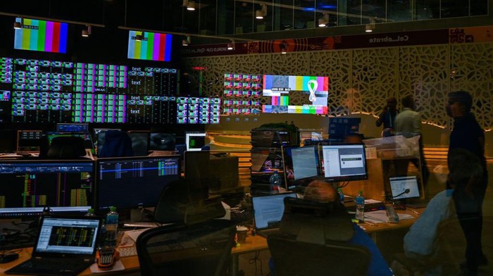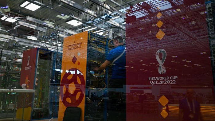 Teknisi bekerja di ruang server di International Broadcast Center (IBC) di Doha, Kamis, (27/10/2022), menjelang turnamen sepakbola Piala Dunia 2022 Qatar.
