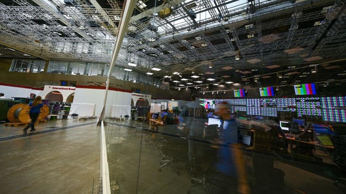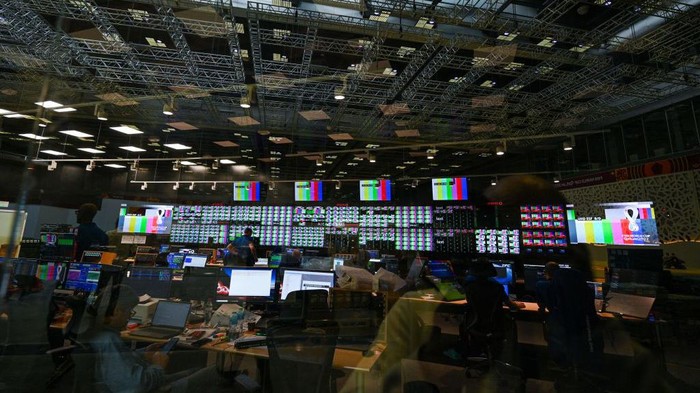 Aktivitas pekerja di ruang kontrol di Pusat Siaran Internasional atau International Broadcast Center (IBC).