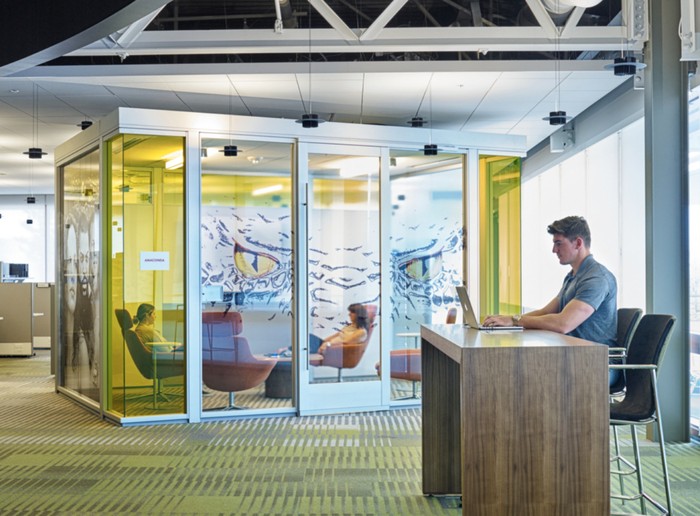 Karyawan berdiskusi di salah satu ruang kecil yang disediakan. Foto: Office Snapshot