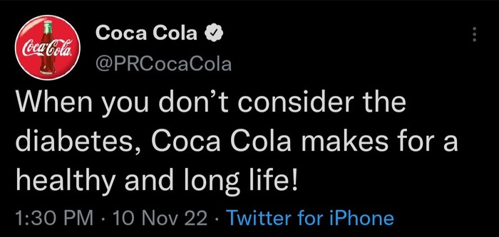 Akun palsu centang biru, pura-pura jadi Coca Cola menghina penderita Diabetes. Coca Cola sudah memprotes hal ini kepada Twitter. Foto: (Twitter)