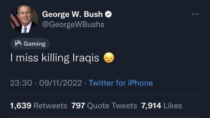 Akun George W Bush palsu centang biru mengucapkan kalimat provokatif, rindu membunuh rakyat Irak. Foto: (Twitter)