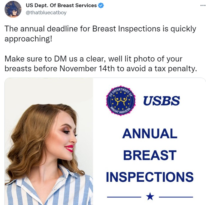 Kantor kementerian palsu di Amerika dengan centang biru, namanya Kementerian Layanan Payudara. Foto: (Twitter)
