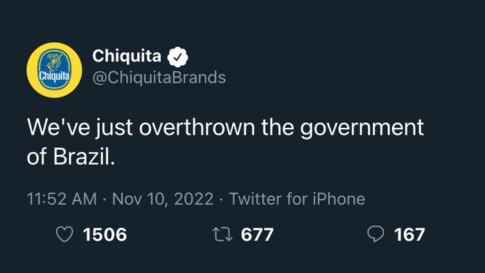 Akun palsu centang biru, pura-pura jadi perusahaan buah Chiquita dan mengaku menggulingkan pemerintahan Brasil. Foto: (Twitter)