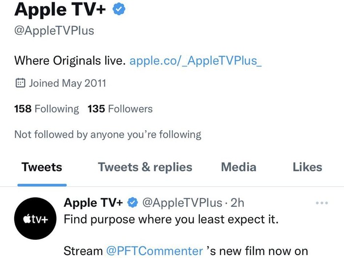 Yang meresahkan, ada akun palsu Apple TV+ dengan centang biru, menyerupai aslinya. Banyak konsumen terkecoh. Foto: (Twitter)