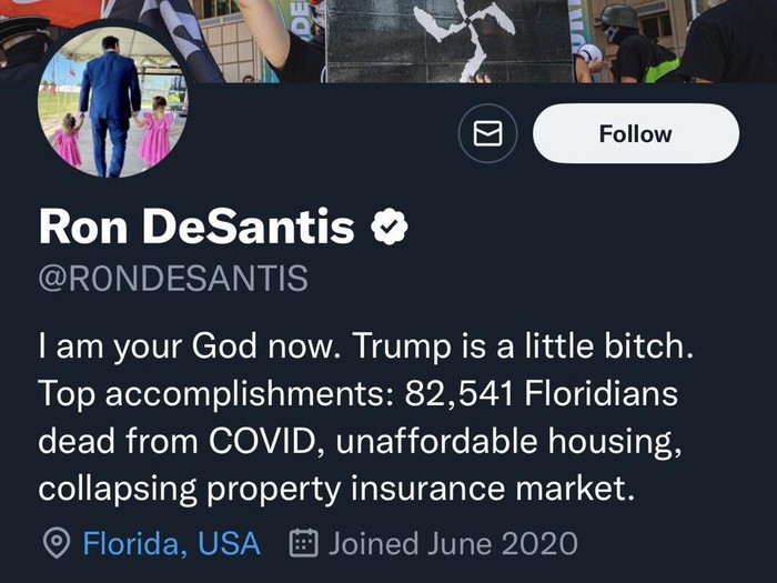 Akun palsu centang biru berpura-pura jadi Ron DeSantis, politisi Partai Republik. Tweetnya menghina Donald Trump. Foto: (Twitter)