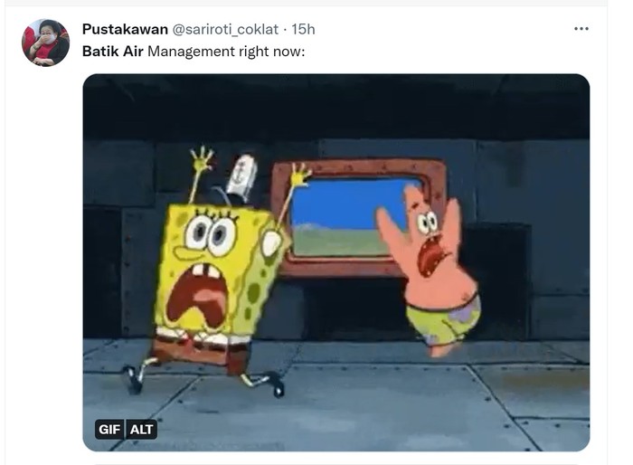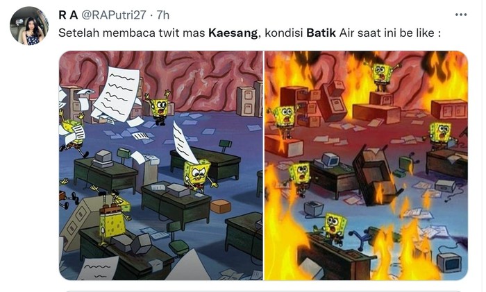 Meme Spongebob untuk menggambarkan suasana di kantorΒ maskapai usai dapat laporan soal koper Kaesang. Foto: Twitter
