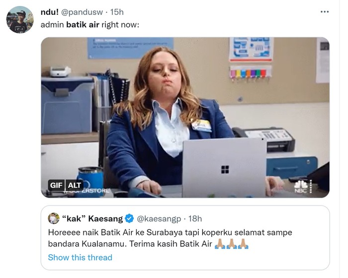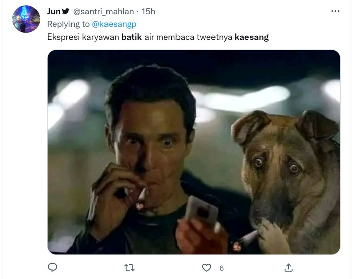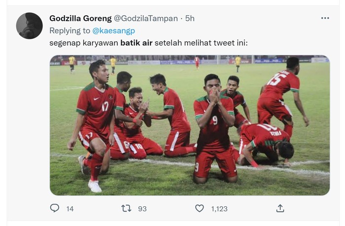 Meme ini ceritanya admin medsos Batik Air begitu dapat tweet dari Kaesang. Foto: Twitter